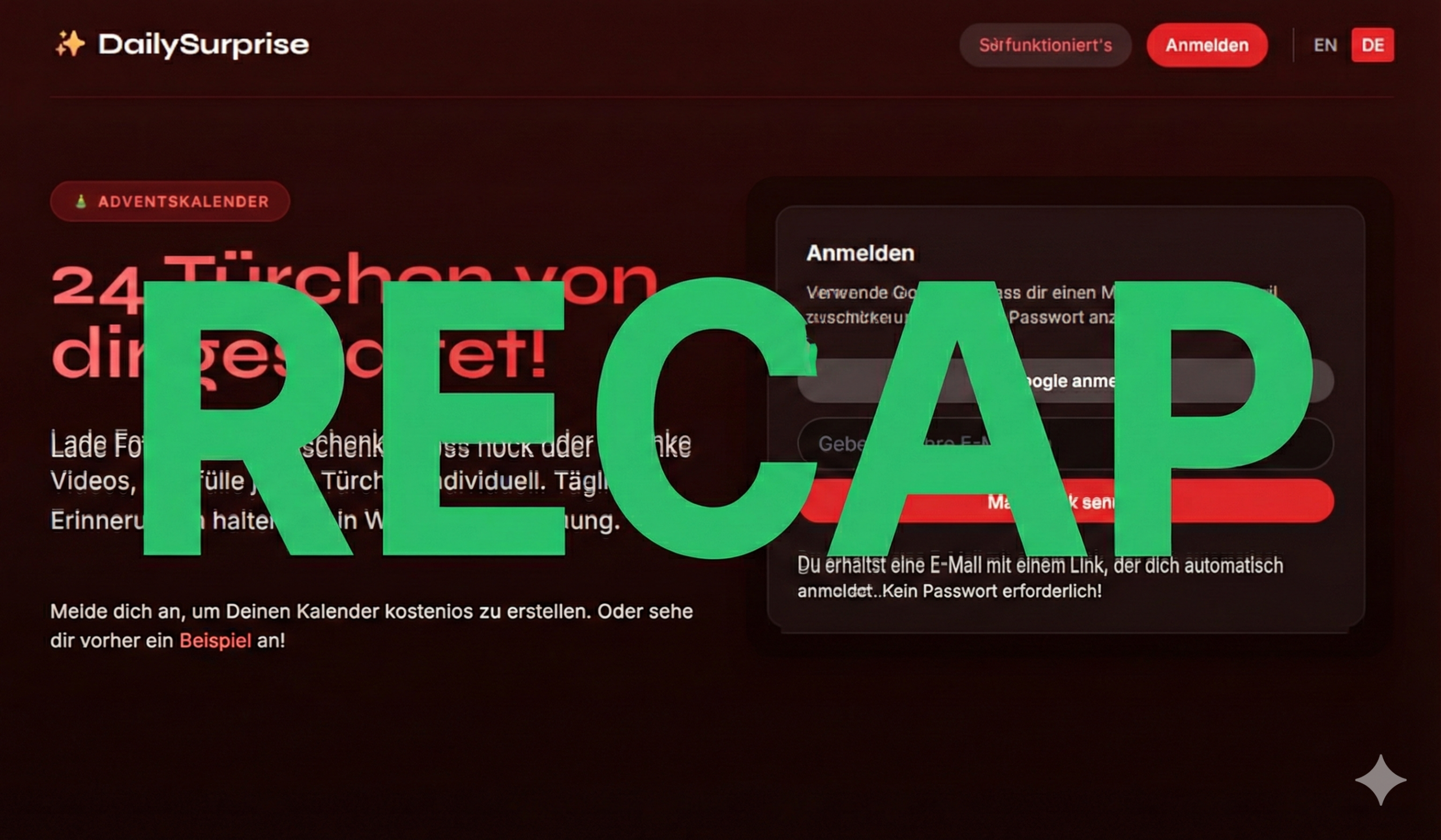 Advent ist nur einmal im Jahr – aber Fernbeziehungen sind das ganze Jahr über. In den nächsten Monaten bau ich ein Feature ein, mit dem man die Laufzeit selbst einstellen kann. Die Idee: „Until we meet again“-Kalender für Long-Distance-Paare. Ein Countdown bis zum nächsten Wiedersehen, mit täglichen Überraschungen.